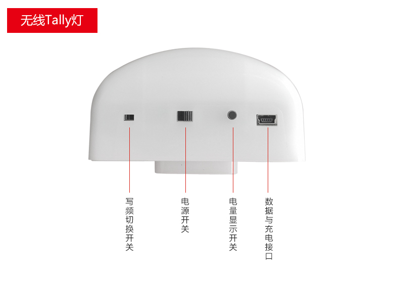 | 配置 | 無線TALLY系統主機 1臺,無線Tally燈 4個,充電套件4條,寫頻數據線 1條,串口連接線 1條。 |