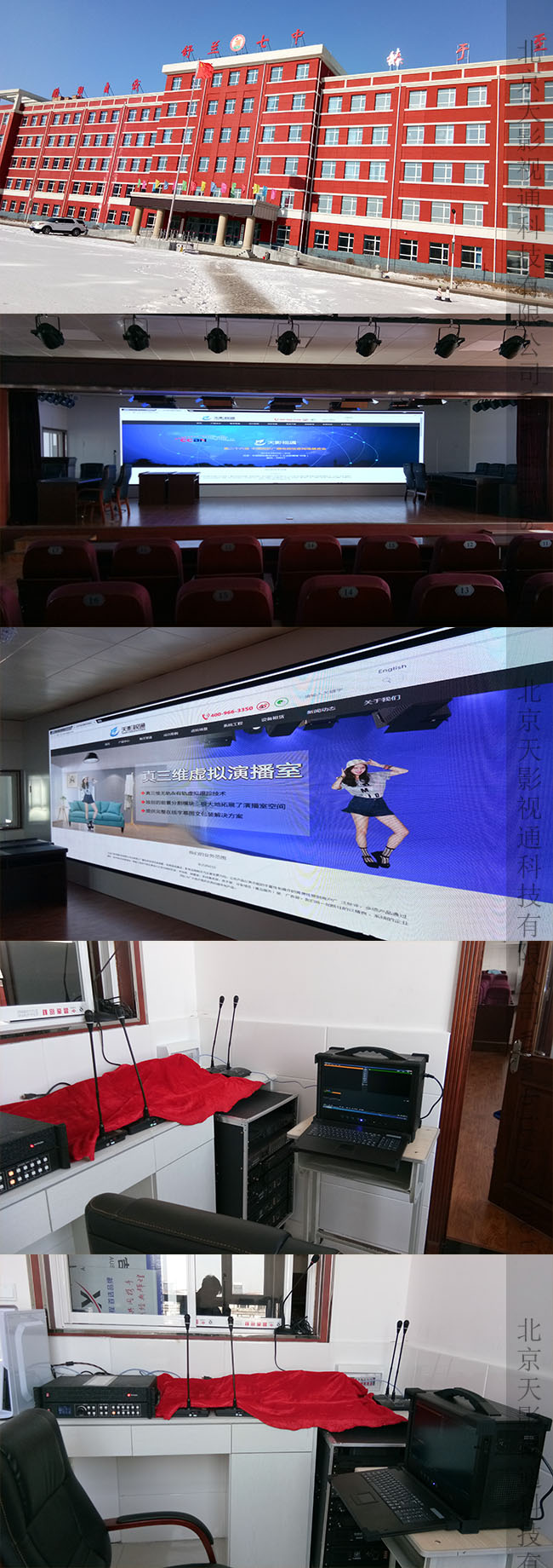 舒蘭第七中學,局域網(wǎng)直播,本次工程結(jié)束實現(xiàn)了32個教室同時直播,攝像機拍攝現(xiàn)場畫面后通過設(shè)備把直播的內(nèi)容實時播放到各個教室上也可投放至大屏,也可提前錄制需要播放的視頻進行錄播,實現(xiàn)不出教室便可開會,發(fā)布信息。也可一師多課堂授課。大大的節(jié)約教師人員的工作量,也省去學生集體去會場的時間,也避免擁擠時會造成的安全問題。整套的直播設(shè)計方案以及設(shè)備安裝調(diào)試,全程由北京天影視通承擔完成。大大的解決了大多數(shù)教學難題,發(fā)揮了現(xiàn)時代互聯(lián)網(wǎng)對教育的重要性。