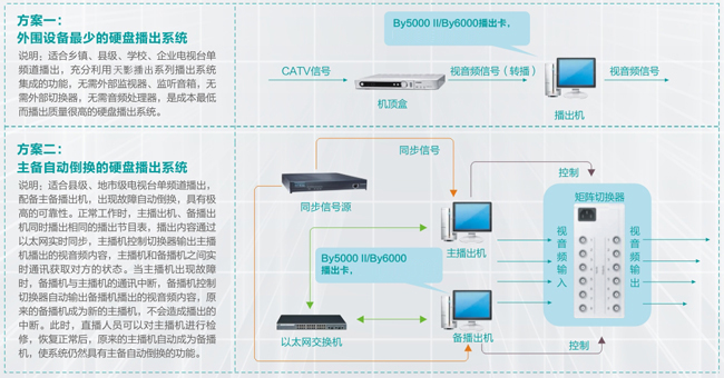 TY-BY6000高清硬盤播出系統,是為中小型電視臺設計的一套完整的高清播出解決方案。使用高清硬盤播出系統,可以輕松實現高清頻道的完整播出流程,使高清頻道的部署不再繁瑣。由于采用了軟件解壓的播出方式,能夠支持幾乎所有電腦上可以播放的節目格式比如RM、RMVB、MP4、WMV等等,并且不會因為節目格式不合法而停播、死機,豐富了用戶的節目來源,節省了大量開支。 TY-BY6000高清硬盤播出系統除了節目兼容性好的特點之外,還可以切換信號處理的模式,可在PAL、NTSC和1080高清3種模式中隨意切換,集成了音頻處理器,自動對節目音量進行實時調整,集成了時基校正器,可以無抖動轉播其他外部節目,集成了全屏字幕,集成了和播出內容完全一致的軟件預監窗口。所有這些功能使得TY-BY6000硬盤播出系統能夠滿足中小電視臺高清播出應用的全部要求。